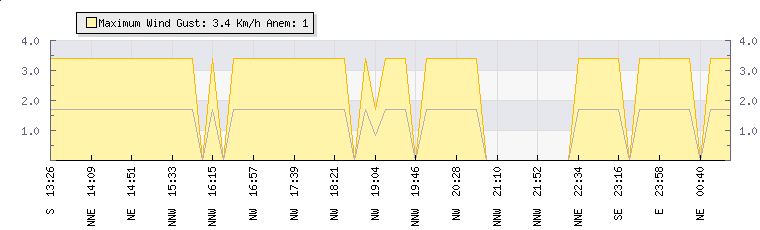 In the last few minutes the wind was South Easterly at an average speed of 2 kmh, reaching up to 3 kmh and a low of 0 kmh. The gust strength is3 kmh above the minimum speed |
