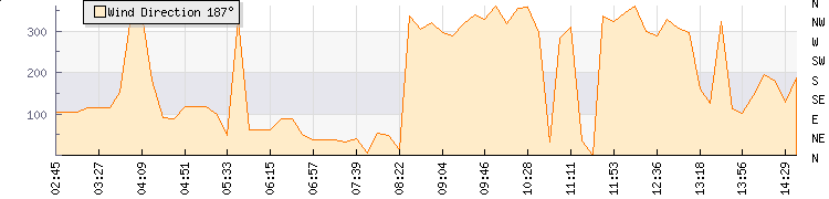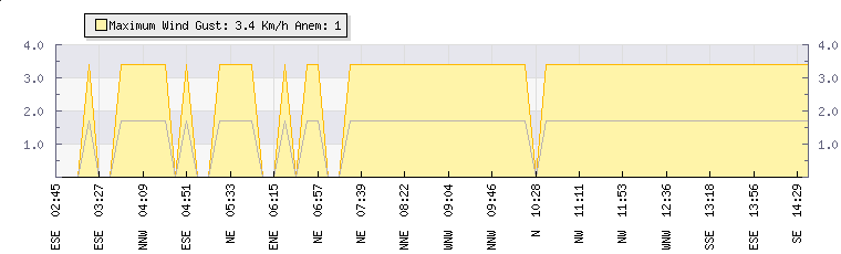 In the last few minutes the wind was North North East at an average speed of 2 kmh, reaching up to 3 kmh and a low of 0 kmh. The gust strength is3 kmh above the minimum speed |