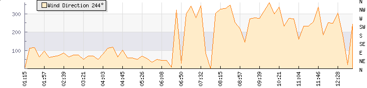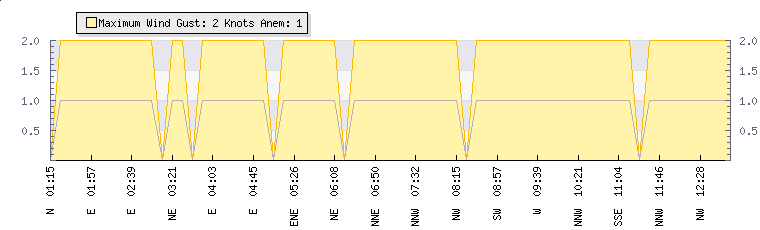 In the last few minutes the wind was West South West at an average speed of 1 knots, reaching up to 2 knots and a low of 0 knots. The gust strength is2 knots above the minimum speed |
