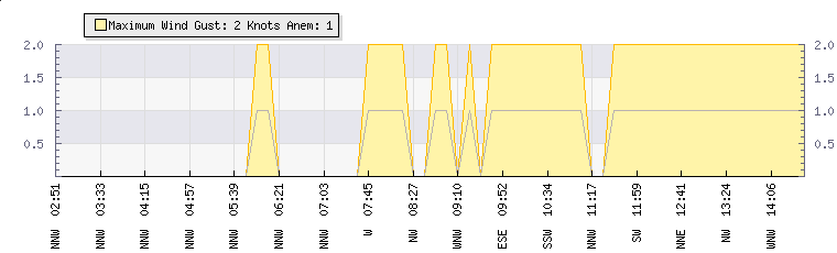 In the last few minutes the wind was South South East at an average speed of 1 knots, reaching up to 2 knots and a low of 0 knots. The gust strength is2 knots above the minimum speed |
