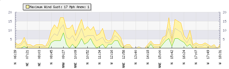 In the last few minutes the wind was West North West at an average speed of 1 mph, reaching up to 2 mph and a low of 0 mph. The gust strength is2 mph above the minimum speed |