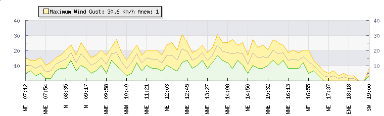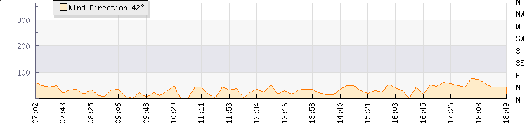 In the last few minutes the wind was North Easterly at an average speed of 3 kmh, reaching up to 5 kmh and a low of 0 kmh. The gust strength is5 kmh above the minimum speed |