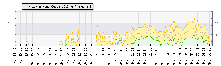 In the last few minutes the wind was North North West at an average speed of 7 kmh, reaching up to 11 kmh and a low of 4 kmh. The gust strength is7 kmh above the minimum speed |