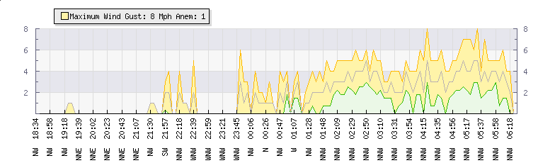 In the last few minutes the wind was North North West at an average speed of 4 mph, reaching up to 6 mph and a low of 2 mph. The gust strength is4 mph above the minimum speed |