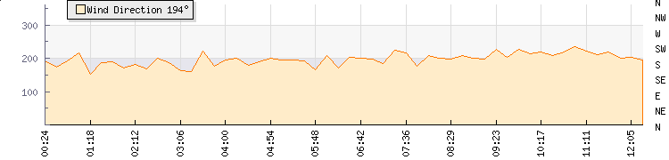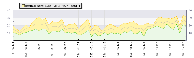 In the last few minutes the wind was Southerly at an average speed of 14 kmh, reaching up to 20 kmh and a low of 8 kmh. The gust strength is12 kmh above the minimum speed |