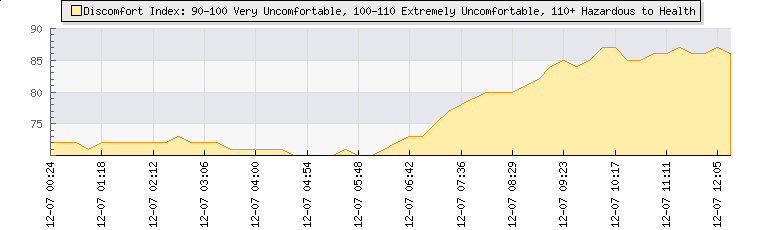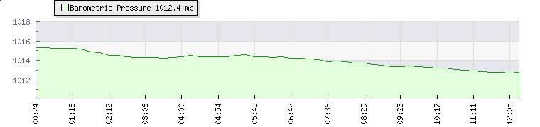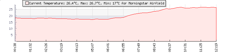 | Wind Speed: | 8|14|20 kmh | Wind Direction: | S 177° | Temperature: | 21.9°C | | Wet Bulb: | 15.7°C | Discomfort: | 79 | Humidity: | 53% | | Rainfall Today: | 0mm | 12 hrs Rainfall: | 0mm | 24 hrs Rainfall: | 76.1mm | | Barometer: | 1013.5mb | Dew Point: | 11.9°C | Clouds AGL: | 4008ft (1222 m) | | Density-Alt: | 1391ft (424 m) | Solar Radiation: | 631Wm² | Fire Danger: | | | Webcam: |  |
