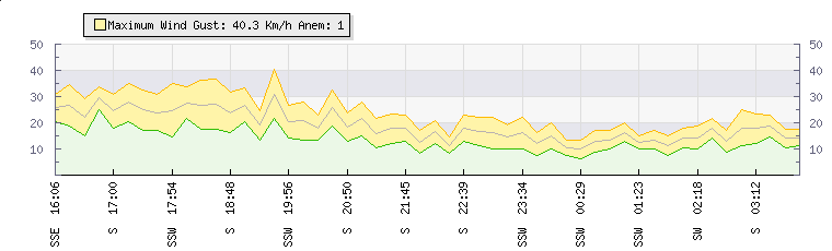 | Wind Gust: | 20 km/h | Min Temp: | 21.2 °C | Max Temp: | 21.7 °C | | Wind Average: | 16 km/h | Min Hum: | 73 % | Max Hum: | 76 % | |  |
