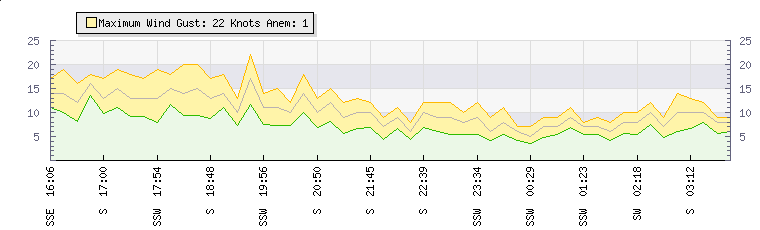 | Wind Gust: | 11 knots | Min Temp: | 21 °C | Max Temp: | 21.7 °C | | Wind Average: | 9 knots | Min Hum: | 73 % | Max Hum: | 76 % | |  |
