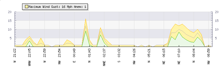 Wind Gust: | 16 mph | Min Temp: | 13.1 °C | Max Temp: | 15.5 °C | Wind Average: | 12 mph | Min Hum: | 90 % | Max Hum: | 93 % | |  |