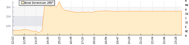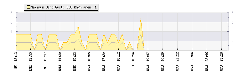 In the last few minutes the wind was West South West at an average speed of 0 kmh, reaching up to 0 kmh and a low of 0 kmh. The gust strength is0 kmh above the minimum speed |