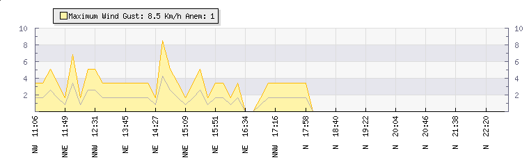 In the last few minutes the wind was West North West at an average speed of 2 kmh, reaching up to 3 kmh and a low of 0 kmh. The gust strength is3 kmh above the minimum speed |