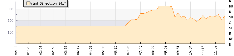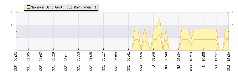 In the last few minutes the wind was South South East at an average speed of 0 kmh, reaching up to 0 kmh and a low of 0 kmh. The gust strength is0 kmh above the minimum speed |