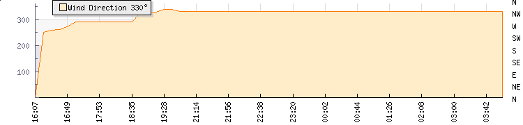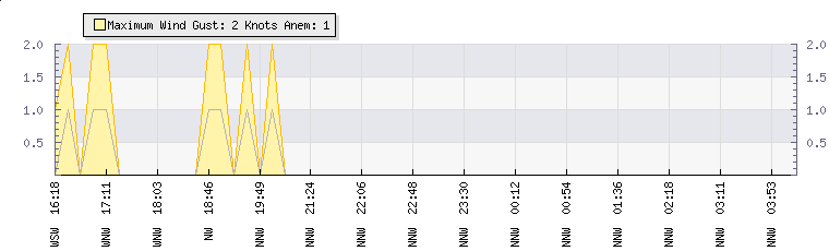 In the last few minutes the wind was North North West at an average speed of 0 knots, reaching up to 0 knots and a low of 0 knots. The gust strength is0 knots above the minimum speed |