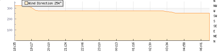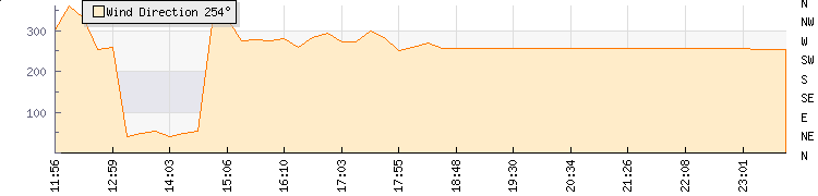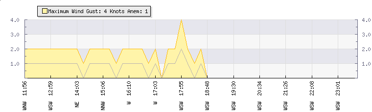 In the last few minutes the wind was West South West at an average speed of 0 knots, reaching up to 0 knots and a low of 0 knots. The gust strength is0 knots above the minimum speed |