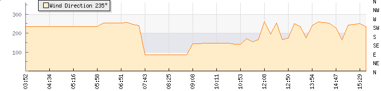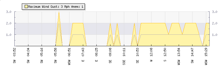 In the last few minutes the wind was West South West at an average speed of 1 mph, reaching up to 1 mph and a low of 0 mph. The gust strength is1 mph above the minimum speed |