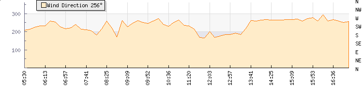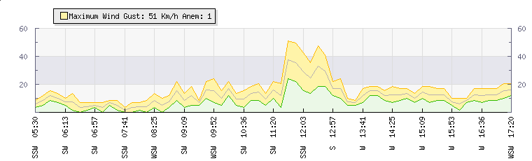 In the last few minutes the wind was Southerly at an average speed of 33 kmh, reaching up to 48 kmh and a low of 19 kmh.  The gust strength is29 kmh above the minimum speed             |