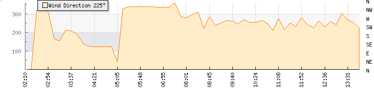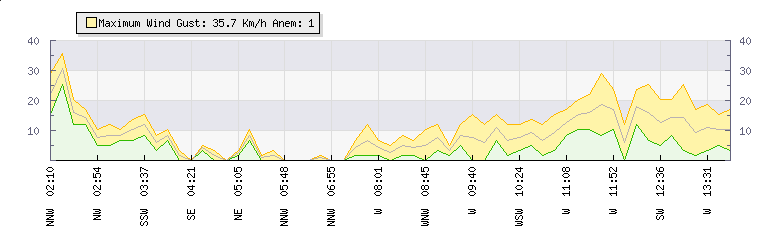 In the last few minutes the wind was Westerly at an average speed of 16 kmh, reaching up to 26 kmh and a low of 7 kmh. The gust strength is19 kmh above the minimum speed |