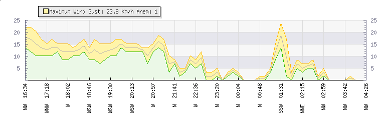 In the last few minutes the wind was North Westerly at an average speed of 0 kmh, reaching up to 0 kmh and a low of 0 kmh. The gust strength is0 kmh above the minimum speed |