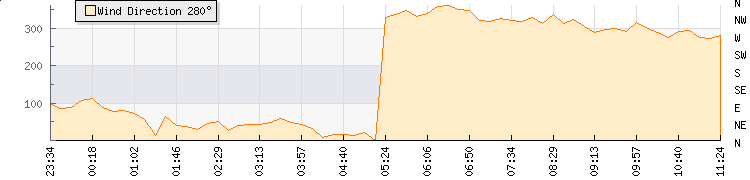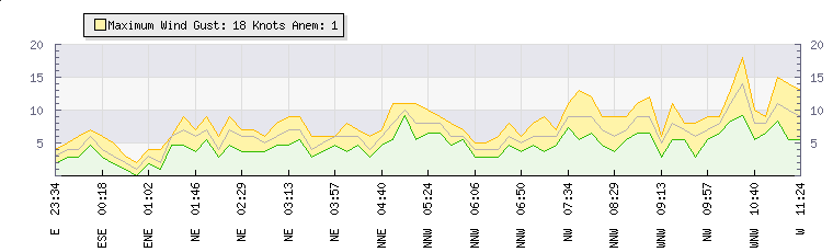 In the last few minutes the wind was West North West at an average speed of 6 knots, reaching up to 8 knots and a low of 3 knots. The gust strength is5 knots above the minimum speed |