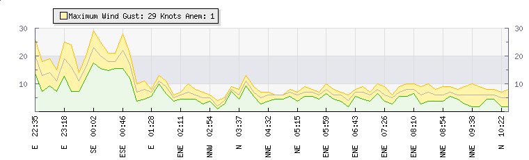 In the last few minutes the wind was North North East at an average speed of 6 knots, reaching up to 8 knots and a low of 4 knots. The gust strength is4 knots above the minimum speed |