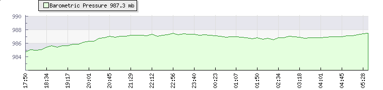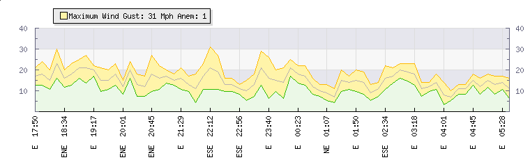 In the last few minutes the wind was East South East at an average speed of 20 mph, reaching up to 23 mph and a low of 16 mph. The gust strength is7 mph above the minimum speed |