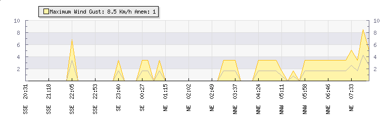 In the last few minutes the wind was North Easterly at an average speed of 2 kmh, reaching up to 3 kmh and a low of 0 kmh. The gust strength is3 kmh above the minimum speed |