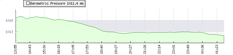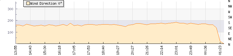 In the last few minutes the wind was South South East at an average speed of 14 kmh, reaching up to 26 kmh and a low of 3 kmh. The gust strength is23 kmh above the minimum speed |