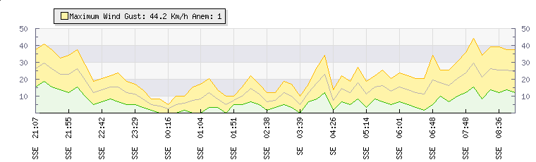 In the last few minutes the wind was South South East at an average speed of 10 kmh, reaching up to 17 kmh and a low of 3 kmh. The gust strength is14 kmh above the minimum speed |