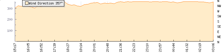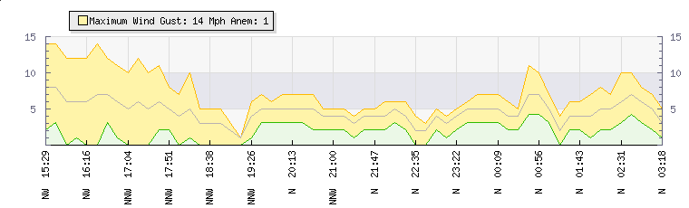 In the last few minutes the wind was North North West at an average speed of 5 mph, reaching up to 6 mph and a low of 3 mph. The gust strength is3 mph above the minimum speed |