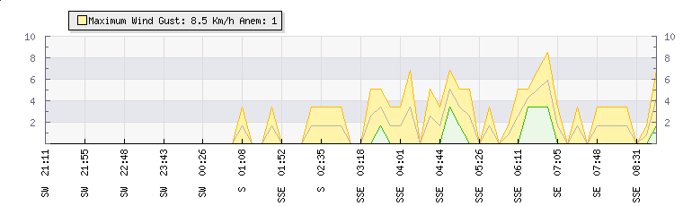In the last few minutes the wind was Southerly at an average speed of 0 kmh, reaching up to 0 kmh and a low of 0 kmh. The gust strength is0 kmh above the minimum speed |