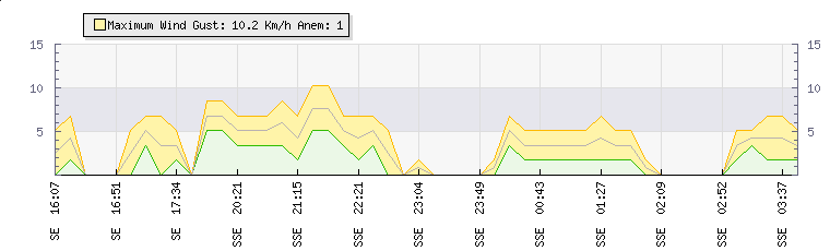 In the last few minutes the wind was South South East at an average speed of 0 kmh, reaching up to 0 kmh and a low of 0 kmh. The gust strength is0 kmh above the minimum speed |