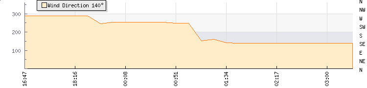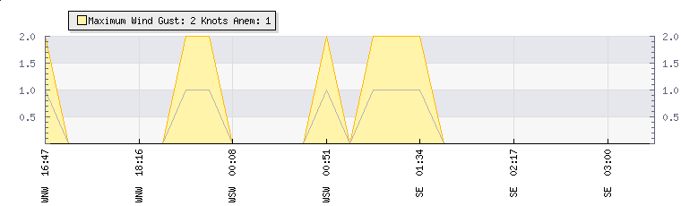In the last few minutes the wind was West South West at an average speed of 0 knots, reaching up to 0 knots and a low of 0 knots. The gust strength is0 knots above the minimum speed |