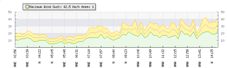 | Last Update: | 2025-10-31 08:29:28 |  | Weather Summary: | In the last few minutes the wind was Northerly at an average speed of 16 kmh, reaching up to 20 kmh and a low of 12 kmh.  The gust strength is8 kmh above the minimum speed |  |