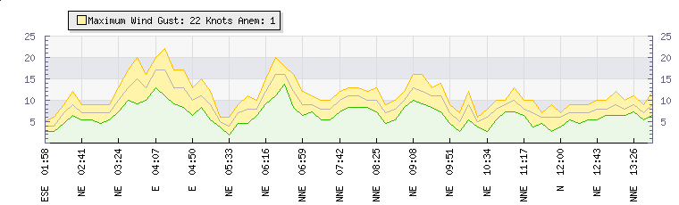 In the last few minutes the wind was North North East at an average speed of 9 knots, reaching up to 12 knots and a low of 6 knots. The gust strength is6 knots above the minimum speed |