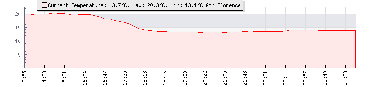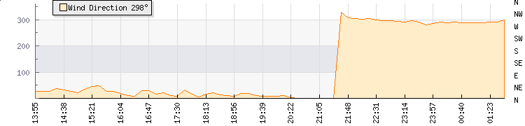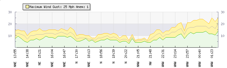 In the last few minutes the wind was West North West at an average speed of 18 mph, reaching up to 24 mph and a low of 13 mph. The gust strength is11 mph above the minimum speed |