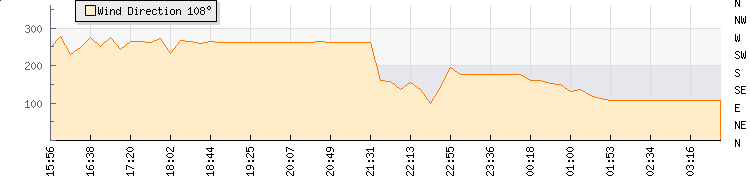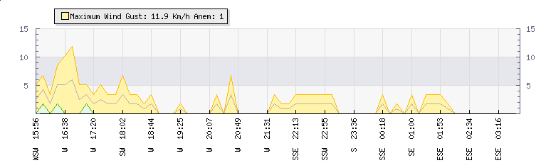 In the last few minutes the wind was East South East at an average speed of 0 kmh, reaching up to 0 kmh and a low of 0 kmh. The gust strength is0 kmh above the minimum speed |
