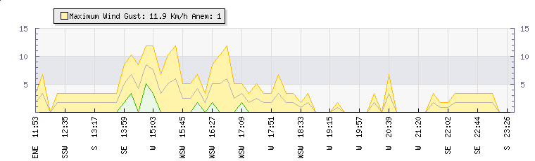 In the last few minutes the wind was Easterly at an average speed of 2 kmh, reaching up to 3 kmh and a low of 0 kmh. The gust strength is3 kmh above the minimum speed |