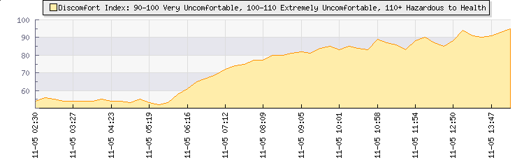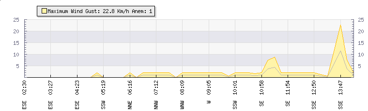 In the last few minutes the wind was North North East at an average speed of 1 kmh, reaching up to 2 kmh and a low of 0 kmh. The gust strength is2 kmh above the minimum speed |