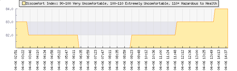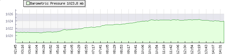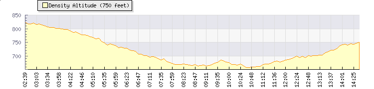 | Wind Speed: | 0|0|0 mph | Wind Direction: | ESE 121° | Temperature: | 22.4°C | | Wet Bulb: | 17.6°C | Discomfort: | 83 | Humidity: | 63% | | Rainfall Today: | 0mm | 12 hrs Rainfall: | 0mm | 24 hrs Rainfall: | 0mm | | Barometer: | 1024.2mb | Dew Point: | 15°C | Clouds AGL: | 2959ft (902 m) | | Density-Alt: | 702ft (214 m) | Fire Danger: | |