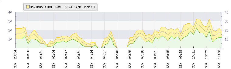 In the last few minutes the wind was South South West at an average speed of 18 kmh, reaching up to 22 kmh and a low of 14 kmh. The gust strength is8 kmh above the minimum speed |