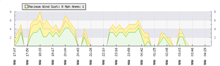 In the last few minutes the wind was North North West at an average speed of 0 mph, reaching up to 0 mph and a low of 0 mph. The gust strength is0 mph above the minimum speed |