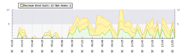 In the last few minutes the wind was South Easterly at an average speed of 4 mph, reaching up to 6 mph and a low of 2 mph. The gust strength is4 mph above the minimum speed |