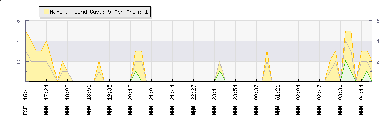 In the last few minutes the wind was West North West at an average speed of 1 mph, reaching up to 2 mph and a low of 0 mph. The gust strength is2 mph above the minimum speed |