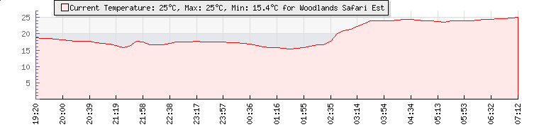 | Area: | Woodlands Safari Estate |  | GPS Co-ordinates: | S 32º 35' 39, E 26º 7' 33 |  | ASL: | 2224 feet |  | Sunrise / Sunset: | 05:19 / 18:40 |  | Beaufort Scale: | Light Breeze |  |