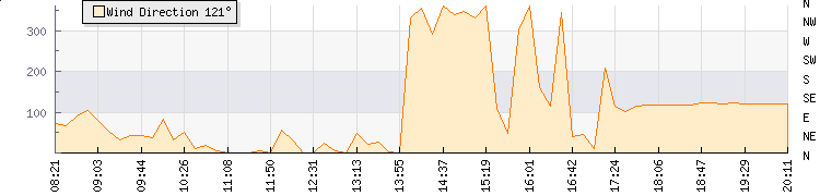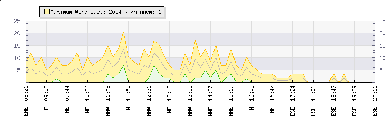 In the last few minutes the wind was East South East at an average speed of 0 kmh, reaching up to 0 kmh and a low of 0 kmh. The gust strength is0 kmh above the minimum speed |