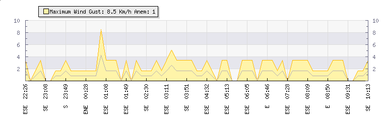 In the last few minutes the wind was East South East at an average speed of 2 kmh, reaching up to 3 kmh and a low of 0 kmh. The gust strength is3 kmh above the minimum speed |
