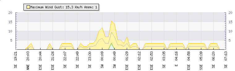 In the last few minutes the wind was South South East at an average speed of 2 kmh, reaching up to 3 kmh and a low of 0 kmh. The gust strength is3 kmh above the minimum speed |