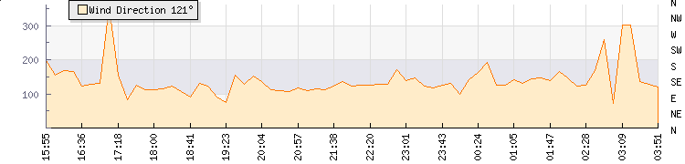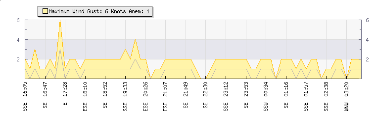 In the last few minutes the wind was South Easterly at an average speed of 1 knots, reaching up to 2 knots and a low of 0 knots. The gust strength is2 knots above the minimum speed |