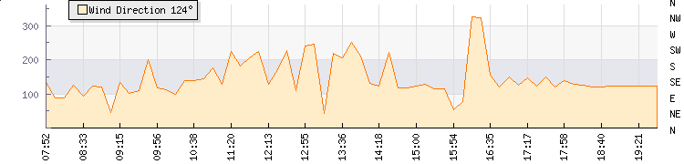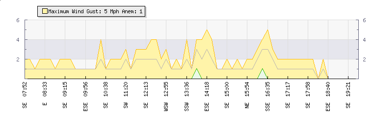 In the last few minutes the wind was South Easterly at an average speed of 0 mph, reaching up to 0 mph and a low of 0 mph. The gust strength is0 mph above the minimum speed |