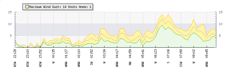 In the last few minutes the wind was Westerly at an average speed of 9 knots, reaching up to 12 knots and a low of 6 knots. The gust strength is6 knots above the minimum speed |
